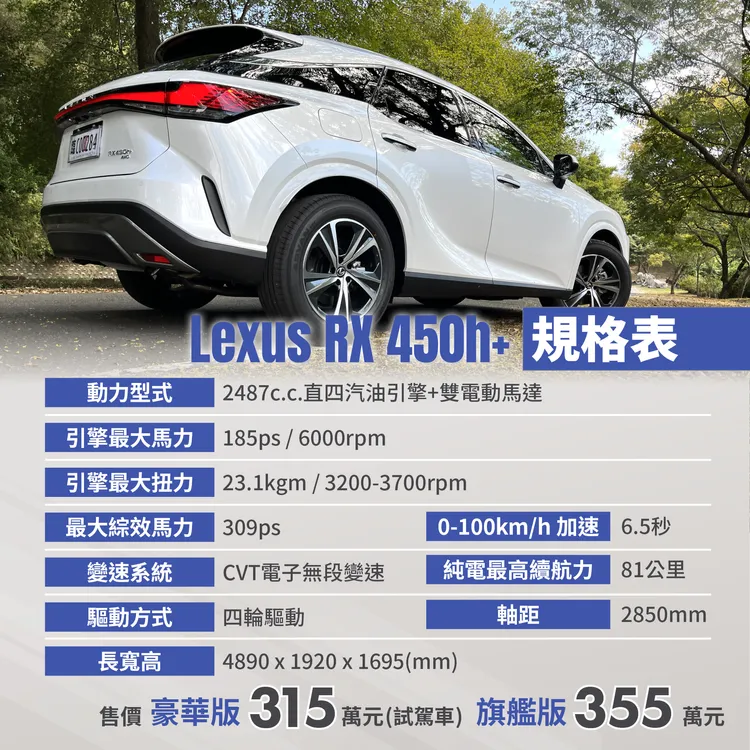 這次Lexus RX大改款,綜合外觀造型、車艙科技應用、動力陣容、底盤結構,到如今消費者最關心的主動駕駛輔助系統,可說是徹頭徹尾的全面大翻新,而實際駕馭RX 450h+豪華版,也能全然感受到Lexus對於這款新車投注的心血與重視。尤其是符合當代趨勢的插電式油電動力,可說是消費者在正式邁進電動化汽車之前的最佳替代方案,相信也將成為未來銷售的主力之一。當然,若有機會我們還是有興趣想體驗RX 500h F SPORT Performance頂級動力,畢竟號稱史上最強的RX,光帳面數據就讓人躍躍欲試、想實際感受它的性能魅力。