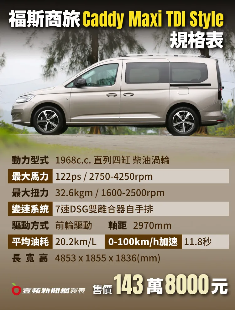 目前在國內,Caddy Maxi則是以2.0 TDI柴油渦輪引擎單一動力,提供Comfort、Life及Style三種車型選擇,而這次試駕的Caddy Maxi Style身為家族旗艦車款,有別於Comfort及Life車款,在外觀上主要是加入鍍鉻套件裝飾點綴與銀色車頂行李架,並且搭配更時髦的17吋Colombo雙色鋁合金輪圈,及輕便省力的電吸式側滑門及尾門。而其餘則維持LED遠近頭燈、同色蜂巢狀的保桿氣壩等既有Caddy Maxi標準特徵,車尾直立式尾燈同樣也是高階的LED規格。
