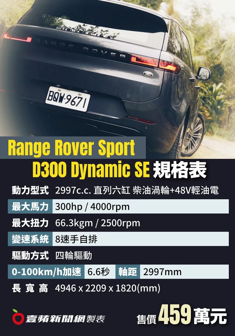 Range Rover Sport D300 Dynamic SE動力本體,搭載的是3.0升直列六缸的渦輪柴油引擎,另外再加入了48V的輕油電系統,使其能輸出300匹的最大馬力,並且在2500rpm就能輸出66.3kgm的強大扭力,在8速手自排變速箱的搭配下,能讓這車重2.3噸的大塊頭在6.6秒完成0-100km/h加速,這實力在實際試駕過程的體驗中,一如過往會讓人覺得有些微違背了物體特性的感受,尤其是當在較高的駕駛座點中,看著窗外景物的迅速飛逝,嘴角不自覺地便會微微上揚。值得一提的是,這具柴油動力運轉精緻度極為出色,不僅聲浪悅耳音頻逼近汽油車,幾乎也感受不到運轉震動,在車內不說破,其實很難察覺這是柴油動力。