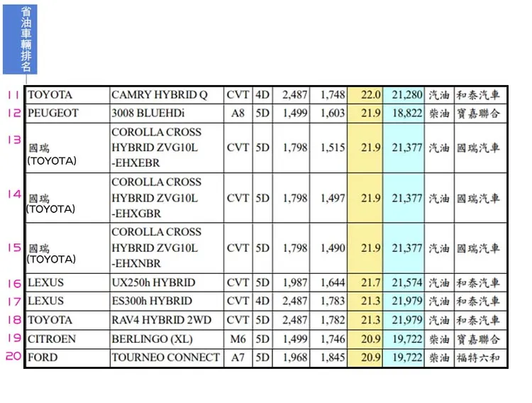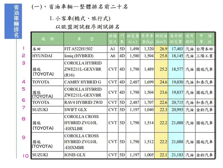 【記者林巧雁、即時中心/綜合報導】經濟部昨公布「車輛油耗指南」,引發網友熱議。且果不其然,TOYOTA國產的 COROLLA﹐在小客車中前十名最省油車佔了四名,想知道哪些車可以幫你省油錢,表格讓您一次掌握!