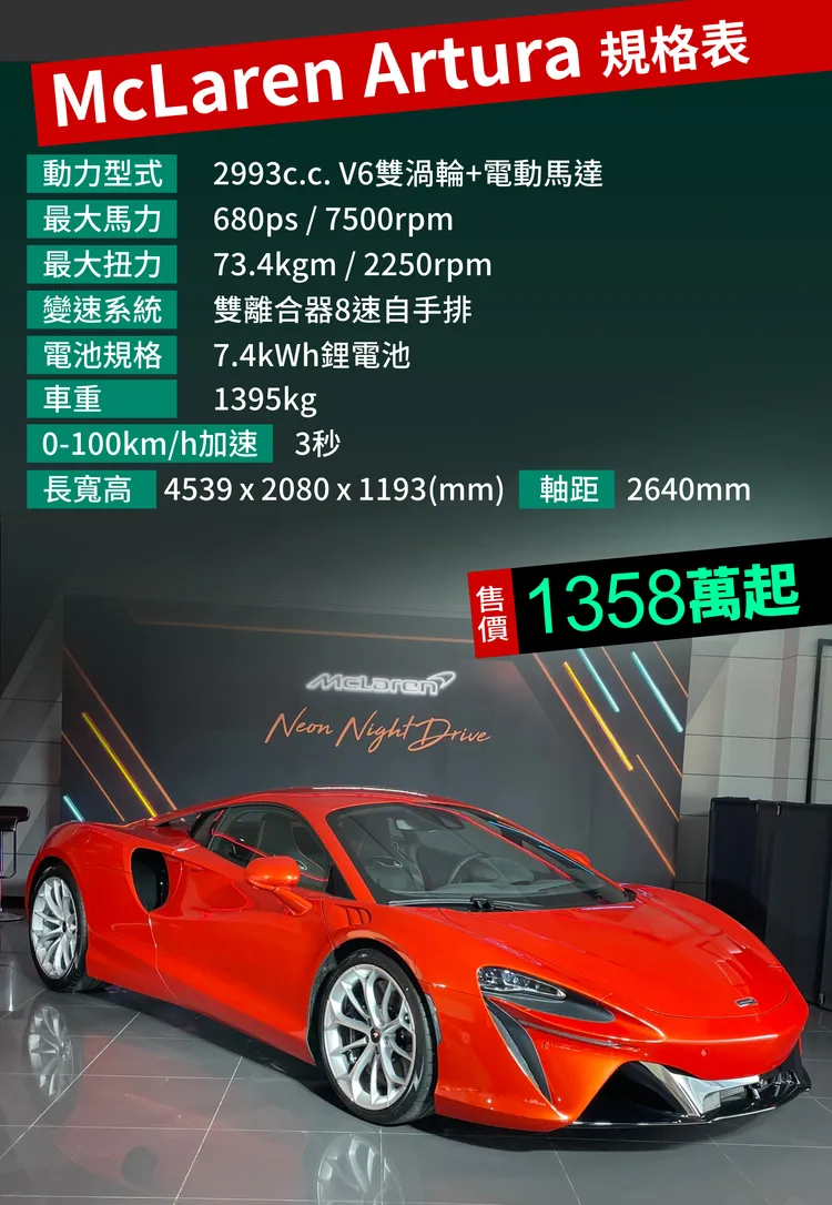 McLaren Artura的發展核心,源自於原廠專為油電及電動化車款發展的MCLA一體式複合碳纖維底盤結構,在以高剛性、輕量化為主要訴求下,使得Artura在搭載油電系統之後,仍能將空車重控制在1395公斤的水準。而在中置後驅的架構中,Artura的動力心臟採用的是代號M630的3.0升V6雙渦輪增壓引擎本體,其結構上採用120度夾角安排,並可輸出585匹最大馬力,以及59.7kgm的最大扭力,另外再加上可提供95匹馬力、22.9kgm扭力的電動馬達之後,成就出高達680匹的綜效馬力,總扭力輸出也來到73.4kgm之譜,搭配雙離合器8速自手排變速箱之後,0-100km/h加速只消3秒鐘就可完成,極速更可來到330km/h的境界。
