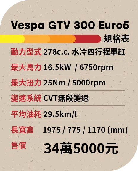 另外,Vespa招牌的前單搖臂懸吊系統和鋼製車體,則是讓300系列因此能合構出美妙均衡的騎乘性格,不僅中高速過彎有著令人喜愛的穩定性,連續彎道的考驗同樣帶著滿滿的自信,GTV 300不只在形象上傳承了1951年六日越野大賽奪冠車種的風格,對於動態操控的耐力與實力,至今仍是得以實現GT壯遊旅程的最佳車種。