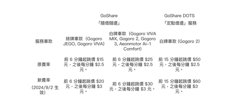 GoShare 首創「暫停模式」,無論是逛超商、等候親友,或是在 GoShare 營運範圍外的短暫停留,用戶不需重新租借車輛,也不再擔心車輛被別人預約,規劃行程更輕鬆自在。9/2 起,將 GoShare App 更新至最新版本(2.13.0 版本以上)即可開始使用「暫停模式」;每趟租借滿 6 分鐘後,就能於 App 隨時啟用「暫停模式」,享受每分鐘 1 元的暫停費率。GoShare 表示,將於 9/2 起亦調整「隨借隨還」服務與「定點借還」服務費率: