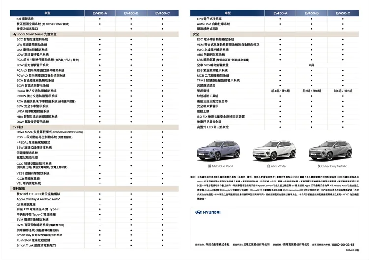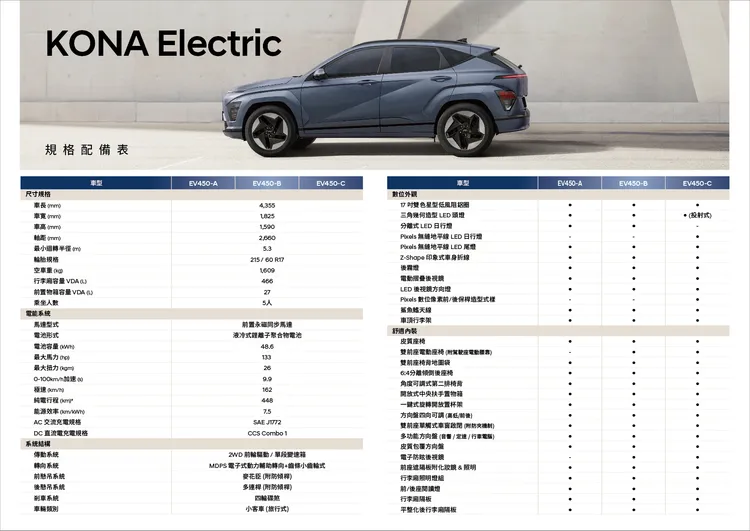 KONA Electric開發第二排全平坦地板,提升乘客舒適度與載貨空間,中央扶手採開放式居家空間設計,並配備一鍵式旋轉開放置杯架,功能性強化,創造更廣泛的生活形式。在安全方面,全車系標配Hyundai SmartSense Level 2主動安全輔助系統,包含SCC智慧定速控制系統、LFA車道跟隨輔助系統、LKA車道維持輔助系統、FCA前方主動煞停輔助系統、BVM盲區影像輔助系統、SVM 環景影像輔助系統等近20項先進安全科技。大改款KONA Electric預計11月起開放顧客交車,自9月6日起於全台Hyundai展示中心展開巡展。