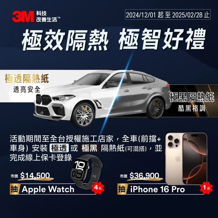 年末將至,3M汽車隔熱膜也祭出優惠活動,即日起至2025/2/28日前,只要到3M汽車隔熱膜原廠授權施工商全車張貼「極透」與「極黑」系列隔熱紙(可混搭),並完成保卡登錄,即可抽市價36,900元的iPhone 16 Pro及市價14,500元Apple Watch。