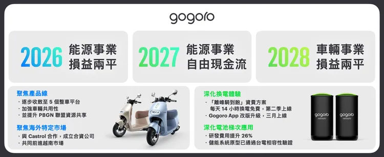 Gogoro 代理執行長姜家煒表示:「作為一家能源科技公司與機車公司, Gogoro 的目標非常明確,就是實現獲利並持續穩健成長。團隊已經積極展開行動,專注核心業務,打造更加滿足客戶需求的產品與服務。我們有信心透過四大策略,能夠在 2026 年達成能源事業損益兩平,2027 年能源事業產生自由現金流,以及 2028 年車輛事業損益兩平。」