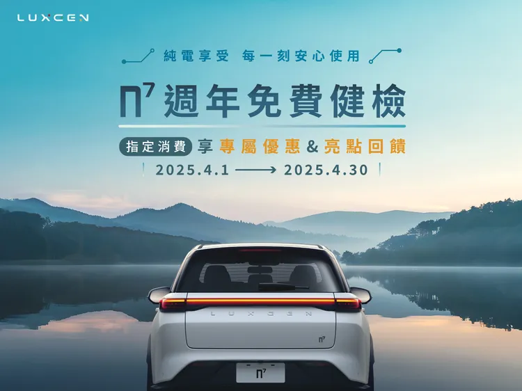 LUXGEN限時祭出的「n⁷ 週年免費健檢」活動,將免費提供「全車健檢」,包含:行車安全,動力、底盤、充電系統、車室內外等專業檢查;同步再享「n7專屬配件」限時優惠,其包含:貫穿式尾燈(原價 $20,000,優惠價 $13,000 / 含尾燈組與安裝費用)、前艙蓋氣壓撐桿套件(原價 $10,170,優惠價 $9,688 / 含套件與安裝費用,工法依現場服務人員說明為主)、LuxAero導流尾翼(原價 $9,360 ,優惠價 $8,800 / 含尾翼與安裝費用)等超值回饋;不僅如此,還有特別祭出「n7限定優惠」,包含:原廠級專業鈑噴最高85折優惠(不含零件)、鍍膜最高享9折等多項專屬禮遇。