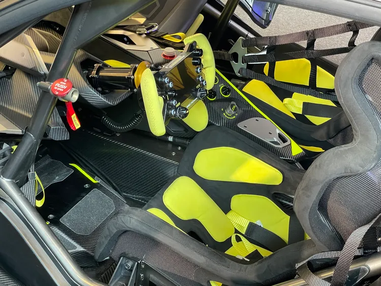 進入座艙, GT2 Stradale 結合 Maserati GT2 賽車與 MC20 的設計語彙,搭載由 Dallara 賽車工作室打造的單體式碳纖維車艙,以黑色 Alcantara 麂皮材質鋪陳,勾勒出極具駕駛導向的競技氛圍,同時降低擋風玻璃反光,提升駕駛專注度。方向盤採用黑色 Alcantara麂皮包覆與碳纖維飾板,上下水平設計帶來絕佳手感,整合式賽道轉速指示燈與碩大的換檔撥片,令操控上更加精準且直觀,配備的一鍵引擎啟動更進一步優化駕馭便利性。座椅則選用義大利 Sabelt 製造的輕量化單體式碳纖維賽車座椅與可選配的四點式安全帶,搭配藍色 Alcantara 材質,結合柔軟襯墊與肩部加強包覆設計,在維持舒適乘坐感的同時達成輕量化效果,相較 MC20 標準座椅減輕近 20 公斤。