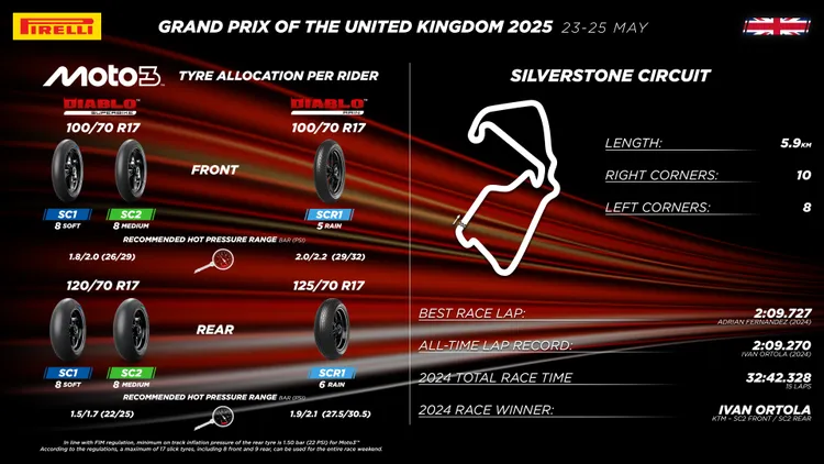 為了應付變化多端的英國賽道,每位Moto2與Moto3車手都可使用4種光頭胎選項(前2+後2),每種配置限量8條。整個週末最多可動用17條胎(前8+後9),外加濕地用胎各5條(前)與6條(後)備戰不時之需。