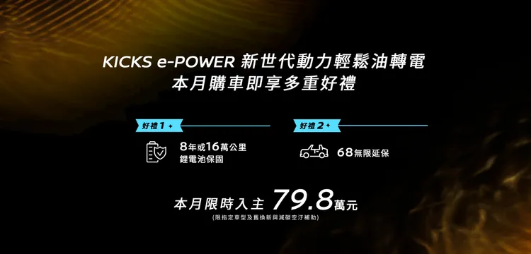 NISSAN自即日起至6月30日止,持續回饋提供KICKS e-POWER專屬購車優惠方案,入主即享「電驅體驗價」79.8萬元起,再享原廠68無限延長保固與鋰電池8年或16萬公里保固雙重保障,讓消費者輕鬆擁有原價104.9萬元的原裝進口純電驅動車款。