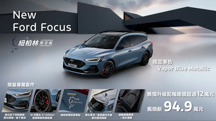 Ford Focus Wagon紐柏林限定版以現行ST-Line Vignale車型為基礎升級,首次搭載Vapor Blue Metallic特殊金屬顆粒漆料,融合藍灰色調並隨光線變化展現細緻層次感,賦予整體視覺更高辨識度與質感。同時,外觀更導入大幅黑化專屬套件,包含車頂、鯊魚鰭天線、尾翼、側裙、後視鏡、門把與下擾流等多處細節,再搭配專屬紐柏林限定版車貼與18吋黑化ST Edition輕量鋁圈,形塑極具性能氣息的旅行車風範。車室空間方面,內裝同步升級運動化跑車座椅,並採用紅色縫線妝點,整體氛圍更顯熱血、動感。