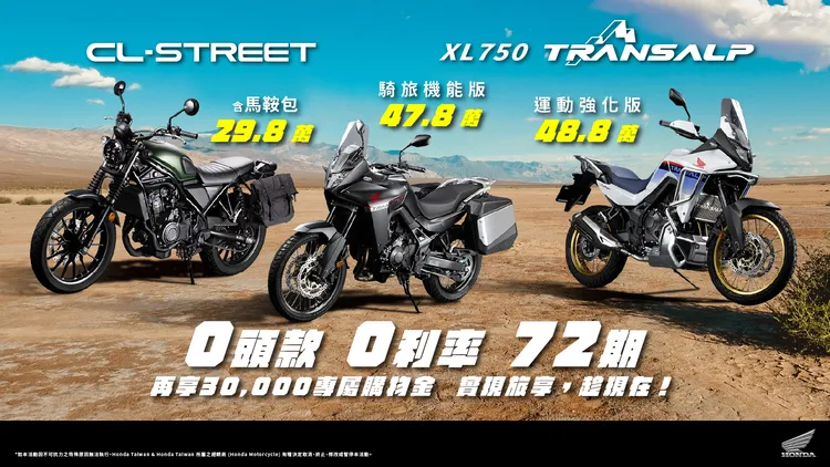 為讓更多人輕鬆享受騎乘樂趣,Honda Taiwan本次專案針對指定車型推出72期分期、零頭款、零利率的購車優惠,額外再加碼三萬元購車金,無論是用來添購騎士人身部品、改裝升級車輛配件,皆能更自由打造個人風格。