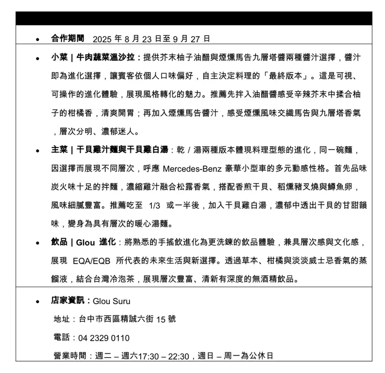 隨著 25/26 年式豪華小型車全面導入 AMG Line 外觀套件、MBUX 2.0 多媒體娛樂系統與智慧停車輔助含 360 環景攝影等新配備,品牌也藉此合作突顯對細節的堅持。Mercedes-Benz 表示,駕馭是一種移動方式,而美食則是生活的品味延伸,兩者結合正是品牌想傳遞的態度。