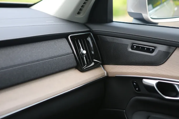 打開車門,XC90 的內裝依舊讓人感覺「像家一樣」。水平對稱的中控台、直立式冷氣出風口、大面積原木飾板,這些元素已經成為北歐設計的經典語言。這次小改款在細節上更用心:中控面板改為雙飾板設計,其中包含了滾邊儀表台與貫穿中央的織布飾板,加上重新布局的氛圍燈,觸感與視覺質感同步提升,而水晶排檔頭如今也是標準配備。整體來說,XC90 並未刻意追隨潮流打造冰冷科技感,而是持續強調一種「溫潤」的體驗讓,乘客能感受到像客廳一樣的舒適。