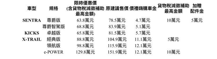 針對本次活動,NISSAN表示,希望透過具競爭力的價格與多重優惠措施,回應市場對中小型房車與休旅車的購車需求,並鼓勵消費者汰舊換新,提升車輛使用效能與安全性。活動期間限定至2025年9月30日,相關優惠與車型適用規格依官方公告為準,實際車型與配件內容則視經銷據點車源與配車情形而定。