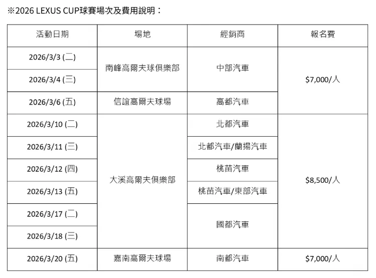 2026 LEXUS CUP賽事獎項豐富,一桿進洞獎包含Lexus時尚跨界休旅LBX Active版乙台、長榮航空亞洲不限航點商務艙雙人來回機票乙組、Tokuyo玩美椅按摩椅乙張及席夢思Bella Plush蓓拉/奇境床墊加州帝皇型乙張,另外更邀請到Canon佳能台灣、法蘭絲、和運租車、大金空調等贊助夥伴共襄盛舉提供賽事豐富好禮,讓球賽更加精采可期。除此之外,凡於2026/1/10前報名成功者,即有機會獲得長榮航空亞洲不限航點單人商務艙機票乙張,詳細賽事給獎辦法與注意事項請參考活動網頁https://www.lexus.com.tw/event/LexusCup。