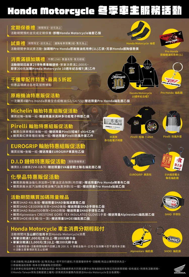 輪胎部分,Honda 亦攜手多家品牌推出冬季特惠組合。選購 Michelin 前後輪一組,可獲得限量米其林多功能電子時曆;Pirelli 則依車款級距不同,提供白牌車種短袖 T-shirt,或黃紅牌車款防風外套作為贈品;EUROGRIP 輪胎前後輪成組購買,則可獲得限量單肩包,讓車主在換胎同時也能獲得實用好禮。