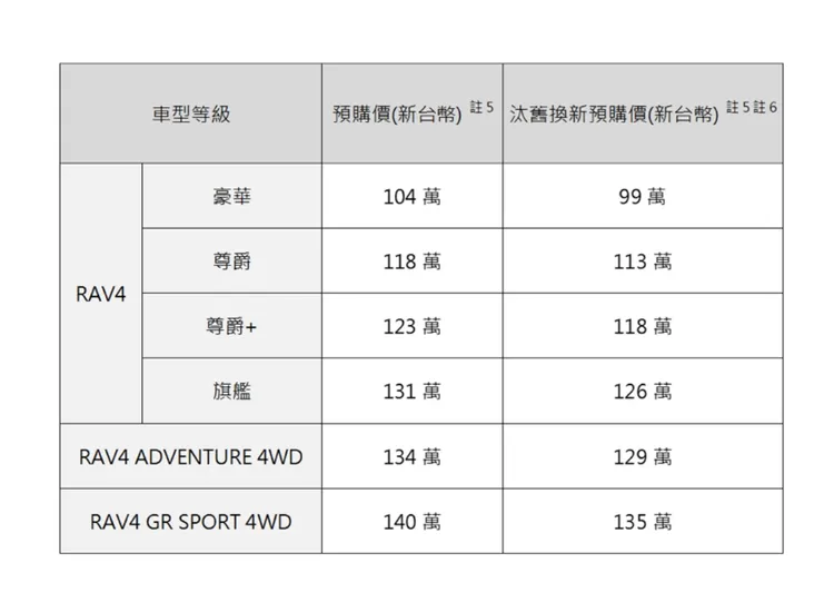 在正式上市前,全新第六代 TOYOTA RAV4 目前已開放預購,汰舊換新預購價自新台幣 99 萬元起,實際車型編成與正式售價仍待後續公布。