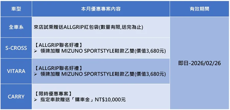 SUZUKI 本次 2026 年式購車優惠方案囊括城市小車、跨界 SUV、商用車及越野旗艦車款,透過升級科技、彈性金融方案與限時回饋,誠摯邀請全台消費者前往各大經銷據點,體驗 SUZUKI 豐富產品陣容及最新科技,與品牌一同迎接嶄新駕馭篇章。