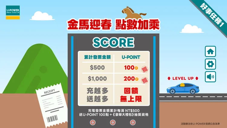 1. 好事任務一|金馬迎春,點數加乘:活動期間內,充電消費發票金額累計每滿 NT$500,即可獲得U-POINT 100 點,累計回饋無上限。讓春節期間的每一趟行程都能轉化為實質回饋。