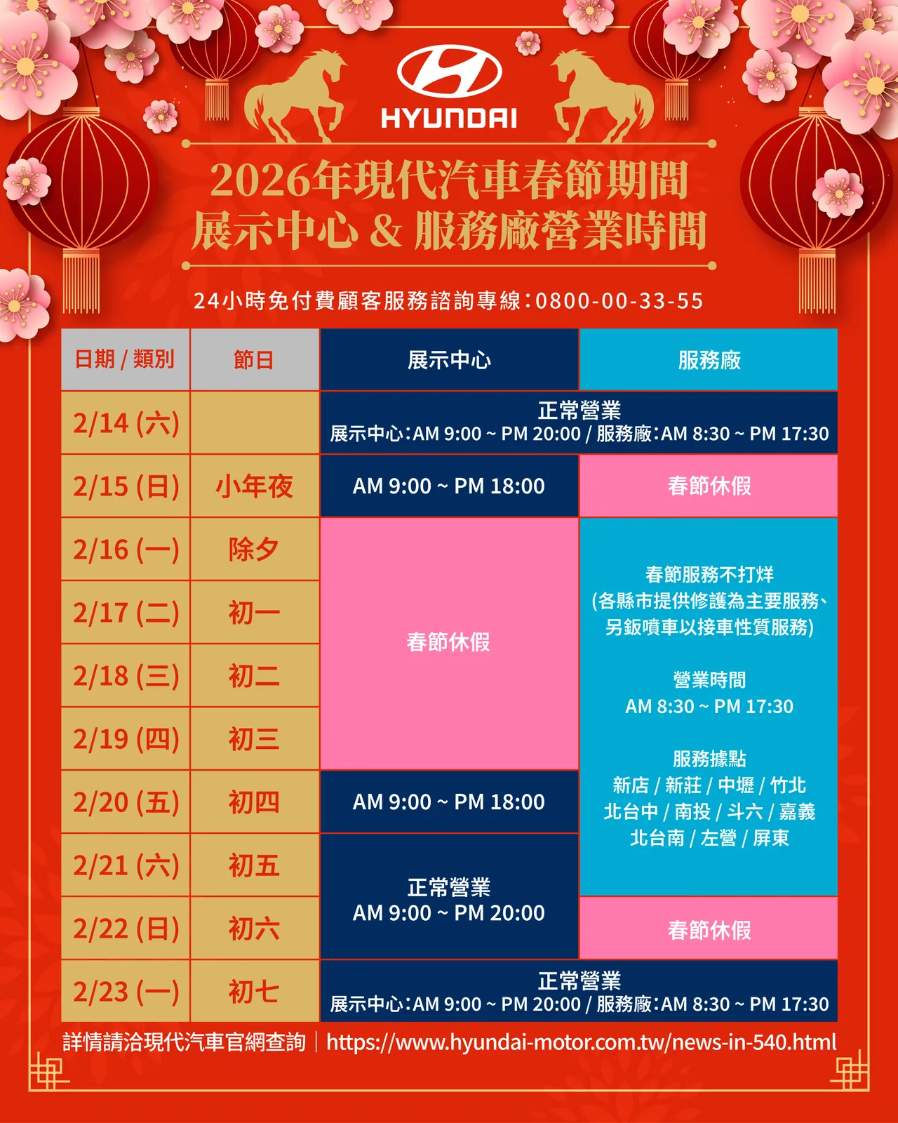 針對電動車主最關心的續航需求,HYUNDAI 領先業界推出 V2V(Vehicle-to-Vehicle)快速充電救援服務,於北、中、南三區核心服務廠待命。當純電車輛在旅途中遇到電力不足時,救援團隊將即刻出動,提供高效、可靠的道路充電支援,有效消除里程焦慮,讓純電車主也能從容享受春節出行。同時,全台 HYUNDAI 展示中心春節期間(小年夜至初三除外)仍提供賞車與購車諮詢服務,由專業銷售顧問輪值接待。