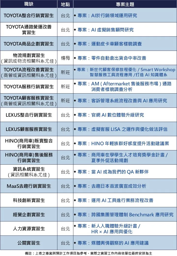 為讓學生更深入了解實習計畫內容,將於3月18日舉辦「和泰之星實習計畫線上說明會」,希望透過線上分享形式,讓更多學生在申請前充分了解實習計畫細節。活動透過企業介紹、計畫說明與學長姐經驗分享,一次完整公開實習計畫資訊,協助同學全面了解企業文化與實習發展機會。