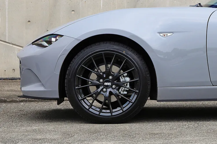 BBS鍛造鋁圈外觀設計採用經典八幅雙肋輪輻造型,搭配槍色塗裝,視覺上更能襯托MX-5低伏緊湊的跑車姿態,同時維持一貫簡潔而富張力的設計語彙。這組鋁圈不僅提升動態表現,也為整體造型增添更鮮明的性能氣息。
