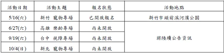 首場新竹場以寵物共跑為主要特色,開放多元寵物參與,包含犬貓以外的特寵類型,並強調以寵物安全與舒適為優先,允許步行或使用推車方式參加。活動現場亦規劃相關互動與服務,包括與中華民國保護動物協會合作的寵物互動展示、限量健康諮詢,以及狂犬病疫苗預約施打等。此外,活動亦邀請許伯&簡芝現場參與,與民眾互動並分享寵物相關內容,增添活動話題性與參與度。