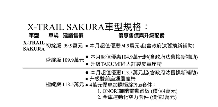 此次導入的 X-TRAIL SAKURA 主打配備升級與價格策略切入市場,入門「初綻版」開出 94.9 萬元起的優惠價。中階「盛綻版」導入 TAKUMI 匠人訂製皮革座椅,高階「極綻版」則進一步加入雙前座通風座椅。另提供「極綻PLUS 套件」選配,包含電動踏板與全車空力套件,以 4 萬元加價對應原廠約 7 萬元配備價值,強化產品吸引力。