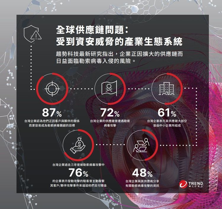 趨勢科技委託Sapio Research於2022年5月至6月期間針對全球26個國家 2,958名IT決策者進行了一項問卷調查。根據該研究結果,台灣有高達87%的IT負責人認為他們的企業正因合作夥伴與客戶的關係而更容易成為勒索病毒覬覦的目標,而有6成以上 (61%) 企業的供應鏈大部分是由資安防護通常較弱的中小企業所組成,使得這項挑戰變得更加嚴峻。