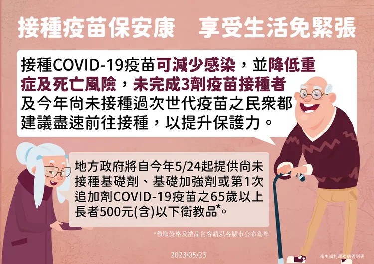 另為加強鼓勵長者儘速接種,各地方政府將自今年5月24日起提供尚未接種基礎劑、基礎加強劑或第1次追加劑COVID-19疫苗之65歲以上長者500元(含)以下衛教品。