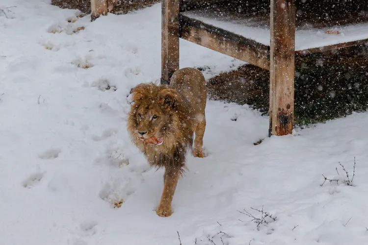 這隻獅子好奇地在雪中漫步一會兒,隨後迅速躲回室內,享受加熱器提供的熱度,緩解低於冰點的氣溫。
