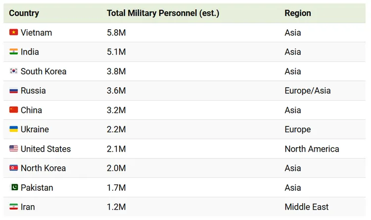 然而,當包括預備役人員在內時,中國軍隊在人員總數上落後於越南、印度、南韓和俄羅斯。