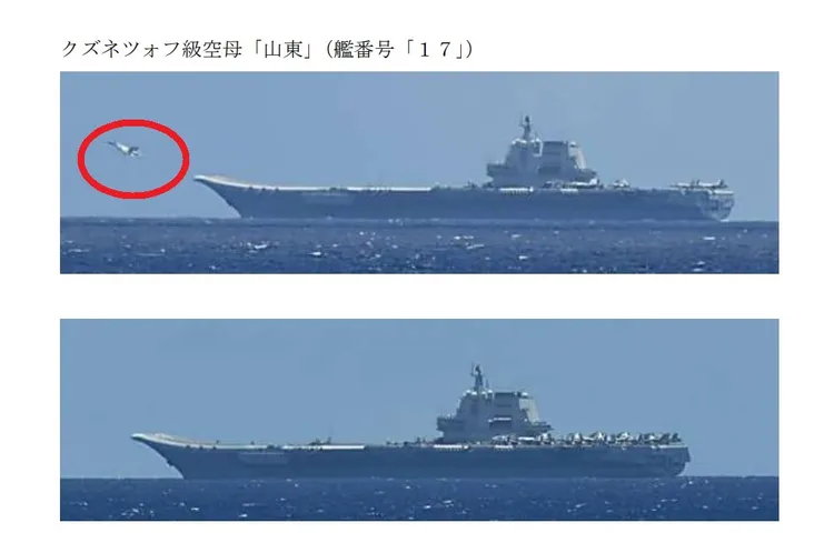 日本防衛省統合幕僚監部直擊解放軍山東艦演練艦載機起降(紅圈)。翻攝日本防衛省統合幕僚監部