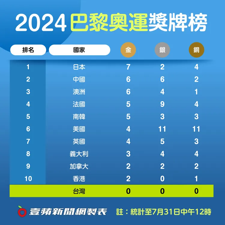 【記者廖柏璋/綜合報導】巴黎奧運前4天賽程結束,日本再拿到1面金牌,依舊以7金2銀4銅高居首位,比較讓人意外的是,傳統強權美國目前雖然有11銀和11銅,但只有4 金,落居獎牌榜第6名。
