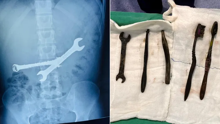醫療團體一開始想用內視鏡來移除患者胃裡的異物,但沒能成功,於是改為進行手術取出,花費超過2個小時,從患者胃裡取出了2支鐵扳手和7支牙刷。