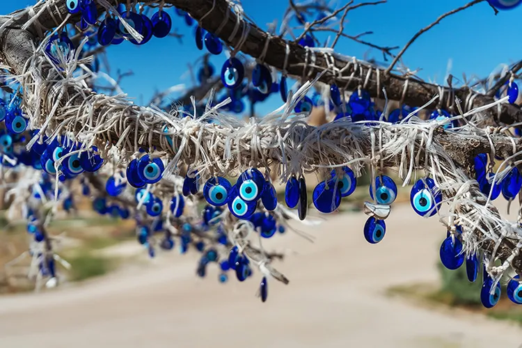 到訪土耳其的人們常會注意到一種特別的景象:藍色玻璃珠掛在商店入口、住宅窗戶,甚至是森林裡的樹上。這些護身符被稱為 Nazar Boncuğu,也就是土耳其藍眼睛。人們相信它們是能夠驅趕災禍與厄運的護身符。邪惡之眼指的是一種觀念,認為因嫉妒或羨慕而產生的惡意眼神,會對他人帶來傷害。這種信念可以追溯到數千年前的古代美索不達米亞,在那裡人們會使用眼睛形狀的護身符作為保護。