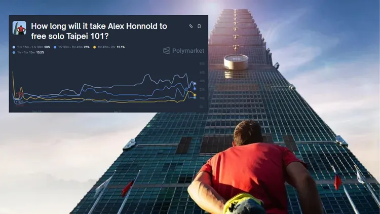 霍諾德挑戰登頂101,市場預測網站Polymarket也開放下注,包括「霍諾德會不會徒手攀爬101」、「他攀爬101時會說什麼」,不過最受關注的則是「他爬101會花多久」。