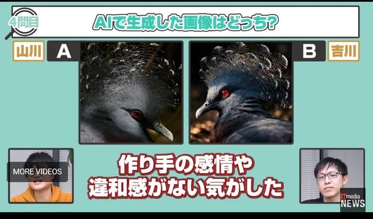 到了第三題專家已經有點動搖,兩張沾麵的食物照片幾乎一樣,兩人只能從桌面的剝落感來判斷,最後判定有桌子剝落感的B照片是生成的