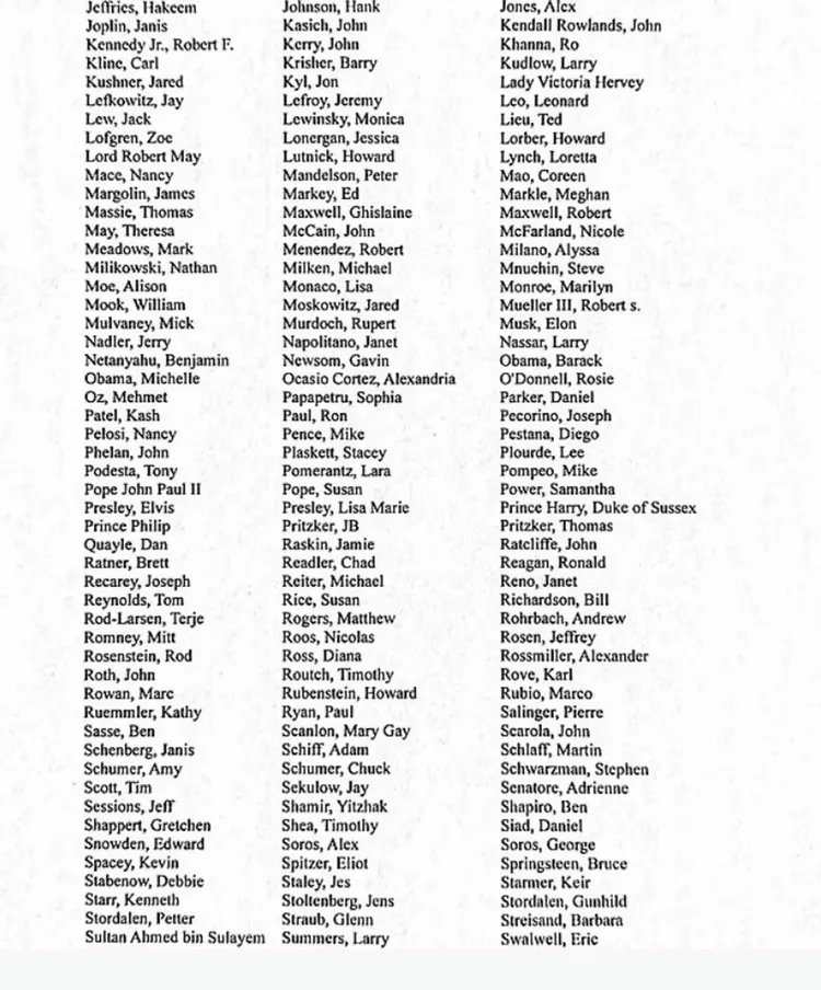 美國政治人物也大量出現在名單中,包括總統川普(Donald Trump)及其副總統范斯(JD Vance)、國務卿盧比歐(Marco Rubio)、歐巴馬夫婦(Barack and Michelle Obama),以及柯林頓夫婦(Bill and Hillary Clinton)。