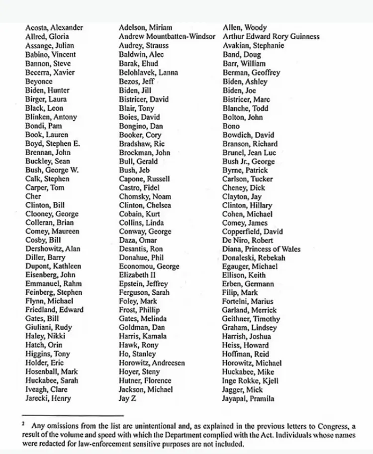 司法部公布的名單裡,涵蓋艾普斯坦所有相關文件——包含電子郵件、照片與信件,至少出現過一次的人名,按字母順序排列。
