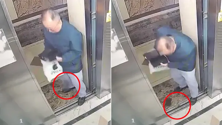 結果新手機掉了出來,手機正好掉入電梯門縫裡,反而是紙盒留了下來,阿伯頓時傻眼不知怎麼辦。