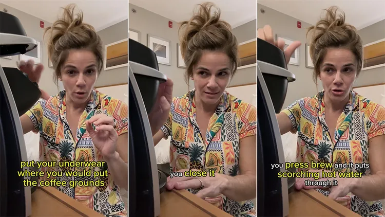 伍德考斯在影片中向網友們提供內褲不夠時的小秘訣,表示可以把內褲塞入咖啡機後啟動沖泡程序,那就能用熱水清潔內褲,然後再用吹風機把內褲吹乾,就有乾淨的內褲可以穿了。她強調這個方式是幾年前一名空服員教她的,而且很多人都知道並使用這個小技巧。