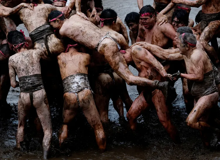 參加祭典者互潑泥水,玩得開心。路透社