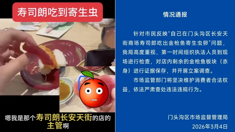 壽司郎表示,仍在確認生魚片上是否為寄生蟲卵,正等待當局檢測結果,該分店已退回女子用餐費用。由於壽司郎在中國極受歡迎,時常要排3小時才能入內用餐,事件引發網路炸鍋,重創日本母公司FOOD&LIFE COMPANIES形象,股價單日暴跌14%。