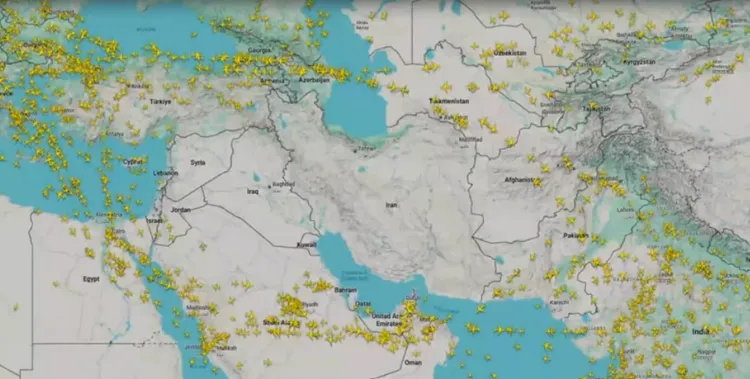 發亮的小黃點代表各國航空的行進路線,截至2月27日,還有部分航班能從伊朗空域安全通行,但到了28日情勢丕變,小黃點不再經過伊朗,有些往北飛行,有些移動南偏,唯獨伊朗、伊拉克、波斯灣等地的上空是一片空白,沒有航班能夠安全航行。
