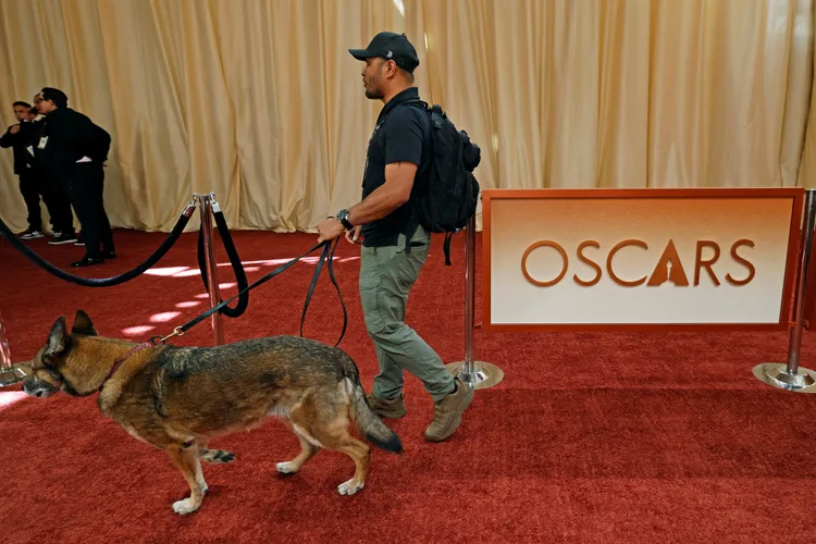 一如往例,通往紅毯區與後台媒體中心的出入口,設置安全檢查點,所有人員必須經過金屬探測門,打開所有的隨身包包接受檢查。與往年不同的是,今年加派警犬嗅聞,確保進入會場的包包沒有危險爆裂物。