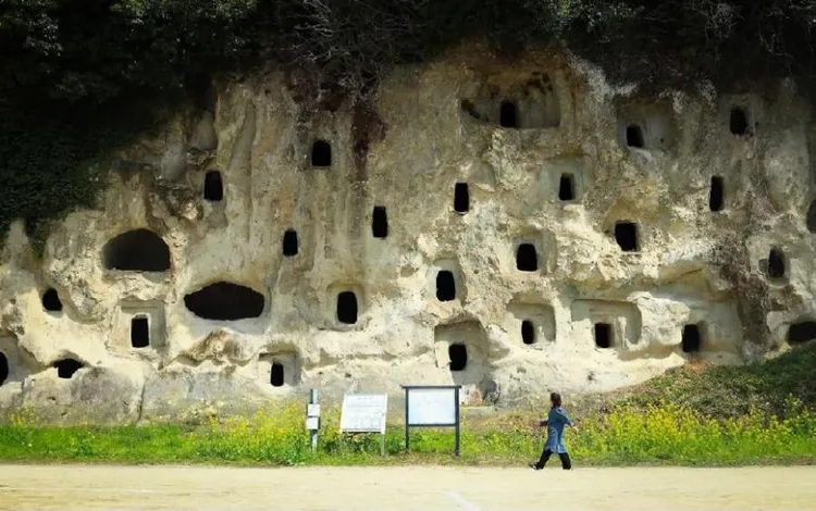 《朝日新聞》報導,從JR大分站往東南約3.2公里、靠近一級河川大分川的大分市羽田地區,有一面布滿無數洞穴的崖壁,外觀宛如「巨大蜂巢」。這裡就是據稱建於6世紀後半、古墳時代後期的「滝尾百穴橫穴古墳群」(たきおひゃっけつよこあなこふんぐん),並於1974年被指定為大分市史跡。