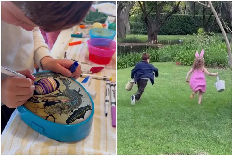梅根在IG分享了一系列影片,記錄她當天餵雞、撿雞蛋,以及看著亞契和莉莉貝在狗狗陪伴下奔跑進行復活節尋蛋活動的畫面。莉莉貝穿著粉紅色洋裝,抱著一隻大型兔子玩偶,頭上還戴著兔耳朵;亞契則忙著裝飾自己的彩蛋。