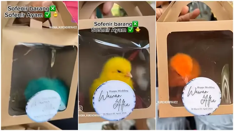 綜合印尼當地媒體報導,這一對新人舉辦婚禮為了給遠道而來的賓客驚喜,竟準備了活體小雞當作婚禮小物致贈,從現場流出的畫面可見,小雞被染成繽紛的五顏六色,有黃色、橙色、綠色等等,小雞還被裝進小小的紙盒內,乍看以為是玩具,細看才知裡面的小雞會動,原來是一隻隻的活體小雞。